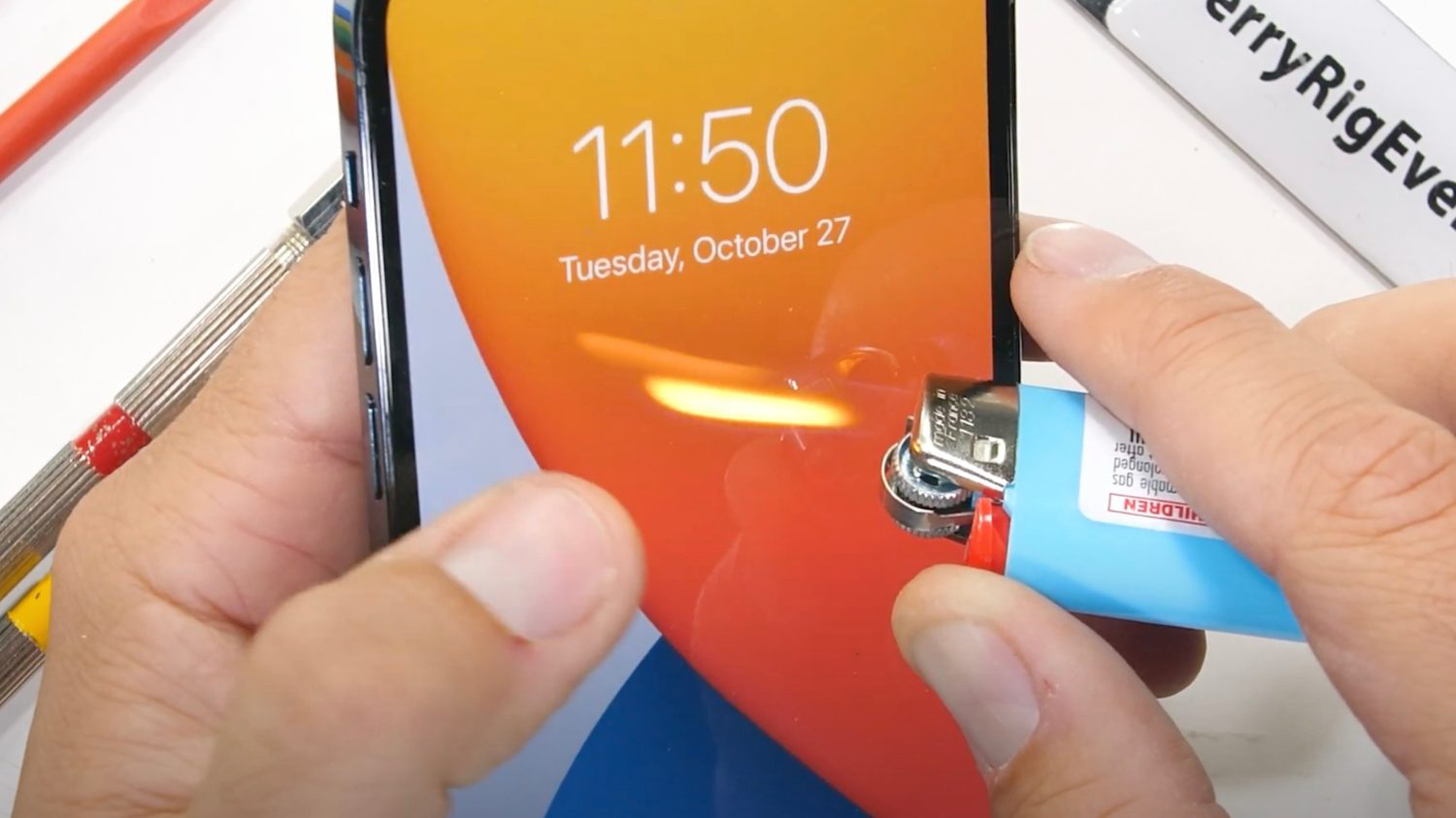 JerryRigEverything az iPhone 12 Pro-t tűzpróbának is alávetette, egy öngyújtót tartva a 6,1 hüvelykes OLED kijelzőhöz. Az öngyújtó hője alatt harminc másodperc elteltével sem sérült az iPhone 12 Pro kijelzője.Ez eltér a többi telefontól, ahol a kijelző gyakran kifehéredik, mivel a hő károsítja a pixeleket, ez is a „kerámia pajzs” előnye lehet. Végül az iPhone 12 Pro új, lapos peremű kialakítása könnyen ellenáll a hajlítási tesztnek, JerryRigEverything a „nem hajlékony mobiltelefonként” emlegeti. A teljes tartóssági tesztet a JerryRigEverything oldalon találja meg.